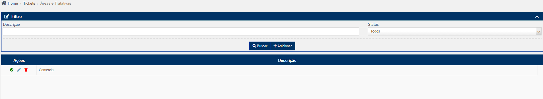Para acessar a tela de "Áreas e Tratativas", destinada à criação e manutenção de áreas e tipos de tratativas para seus atendimentos, será necessário ser um usuário administrador no sistema. Lá, poderá visualizar e/ou configurar todas as áreas e tipos de tratativas. Caso necessário, poderá buscar por áreas específicas, basta preencher um ou mais filtros de "Descrição" e "Status" e clicar no botão de "Buscar".