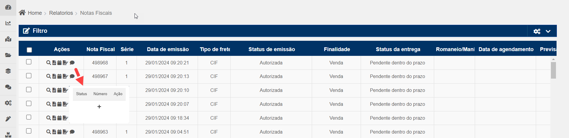 2. Pelas telas de relatórios, como por exemplo relatório de notas fiscais, após realizar a busca pela nota, será exibido um botão “Ticket” na coluna de ações do relatório, ao clicar nele, será aberta a página de formulário para a criação de tickets.