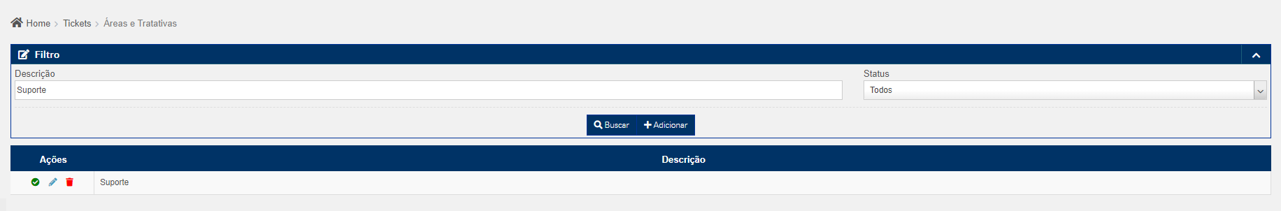 Para acessar a tela de "Áreas e Tratativas", destinada à criação e manutenção de áreas e tipos de tratativas para seus atendimentos, você precisará ser um usuário administrador no sistema. Lá, você poderá visualizar e/ou configurar todas as áreas e tipos de tratativas. Caso necessário, poderá buscar por áreas especificar, basta selecionar os filtros de "Descrição" e "Status" e clicar no botão de "Buscar".
