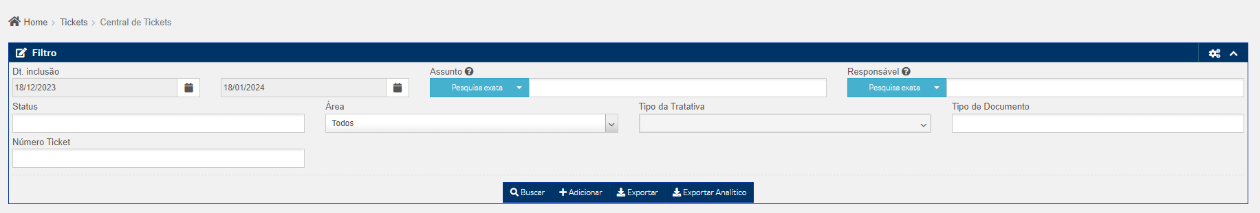 Essa visualização pode ser filtrada de acordo com a necessidade. Por exemplo, tickets podem ser filtrados por data de inclusão, assunto, responsável, documentos ou outros critérios. Após preencher os filtros da busca, clique no botão "Buscar" para visualizar os tickets.